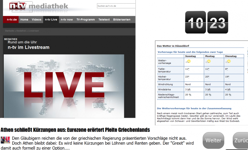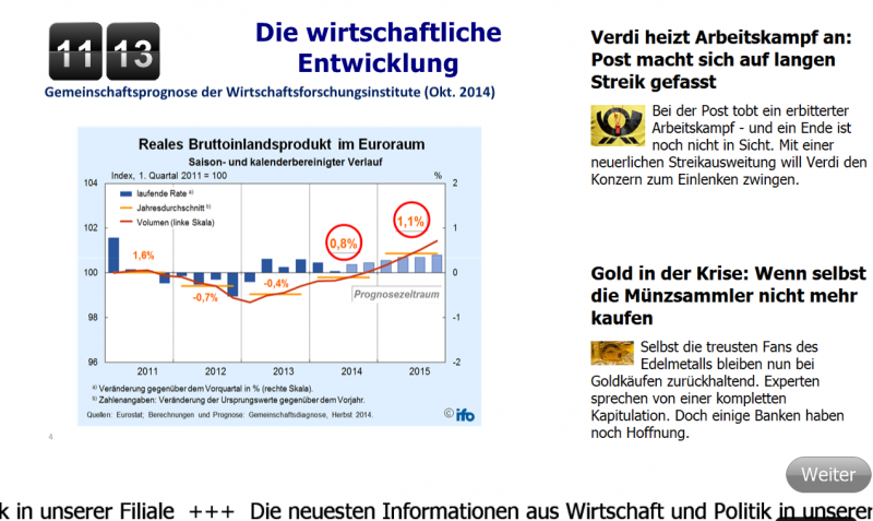Mit einer entsprechenden DS-Software lassen sich verschiedene Anwendungen zeitgesteuert auf Ihrem Bildschirm darstellen oder individuell über einen Touchscrenn steuern. Dabei kann die Aufteilung des Displays frei gewählt werden. Für jeden Teilbereich auf Ihrem Display können unterschiedliche Anwendungen laufen: Zum Beispiel eine Präsentation zur Begrüßung Ihrer Besucher, ein Livestream der aktuellen Nachrichten, RSS Info-Feeds und zusätzlich im unteren Teil Ihres Displays eine Laufschrift mit wichtigen Informationen Ihres Unternehmens. Verküpft werden können all diese Informationen ferner mit der aktuellen Zeit (für verschiedene Zeitzonen) und dem aktuellen Wetterbericht sowie der Vorhersage.Wir bieten Ihnen Basispräsentationen für: