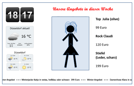Die Bilder und der dazugehörige Text wechseln nach einem vorgegebenen Zeitraum (etwa 10 Sekunden) während die Zeit und der Wetterbericht stets als "Rahmen" erhalten bleiben. Andere Lösungen nach Ihren eigenen Vorstellungen sind natürlich möglich und umsetzbar!
