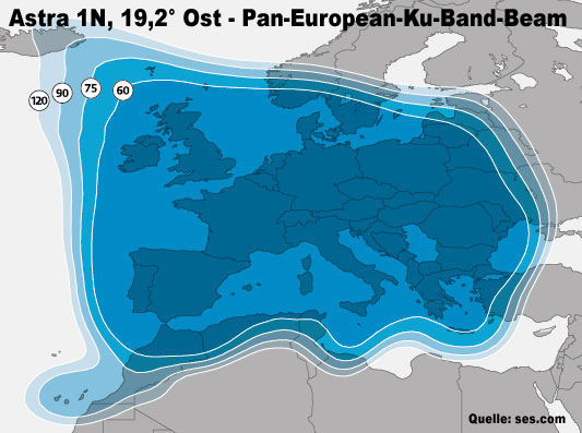 Sie wollen Ihr Ferienhaus, Ihr Wohnmobil oder Ihre Yacht mit einer SAT-Anlage (auf 12 V Basis) ausstatten? K(aum) ein Problem. Wir beraten Sie gerne! Beispielhaft sehen Sie nachfolgend die Abdeckung des Satelliten Astra 1N (19,2° Ost), über den auch viele deutschsprachige Programme abgestrahlt werden, und den notwendigen Durchmesser der SAT-Schüssel, um einen störungsfreien Empfang in einem bestimmten Gebiet zu gewährleisten:
